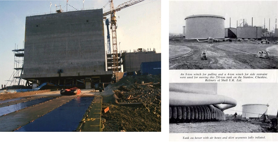 In addition using the skirts to retain a higher pressure loads such as 3000t-6000t concrete caissons have been launched on water cushion or moving an oil storage tank on an air cushion.